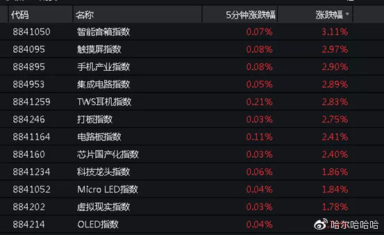 11月14日,A股三大指数小幅收涨,其中科技股表现尤为惊艳。当日,市场领涨概念板块中,智能音箱、触摸屏、手机产业、集成电路、国产芯片、5G等多个科技类股票全面大涨。这些板块,交投活跃度非常高,成交金额均在百亿左右,其中,手机产业、华为概念、国产芯片等板块成交均超450亿。