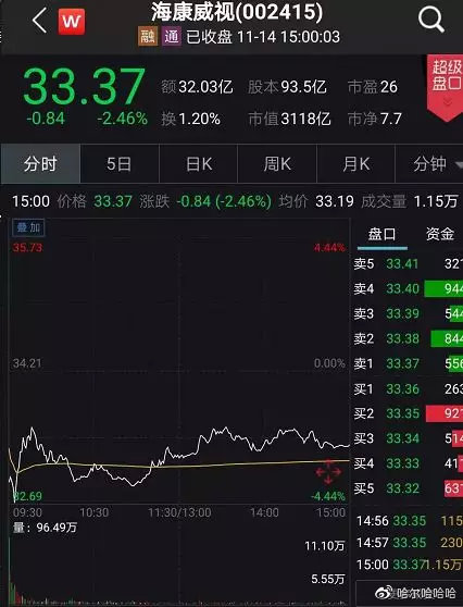 据当天盘面显示,海康威视股价早盘低开,股价一度下跌超4%以上,但临近午盘,海康威视股价却出现了走高的态势,跌幅收窄。截至当日收盘,海康威视股价报收33.37元,跌幅为2.46%。