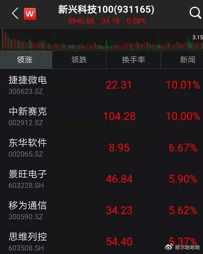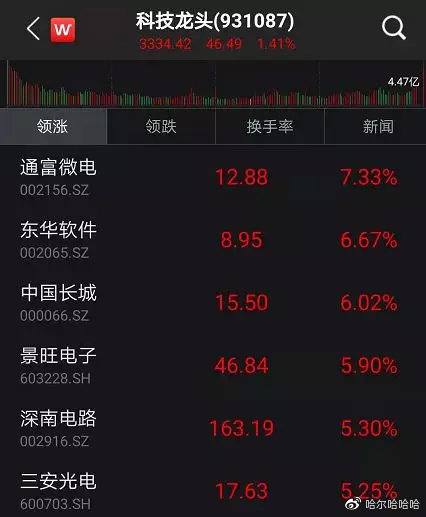 而从板块内看,科技类股票普涨行情明显,中新赛克、东华软件、景旺电子、通富微电多只科技个股也出现了大涨行情。