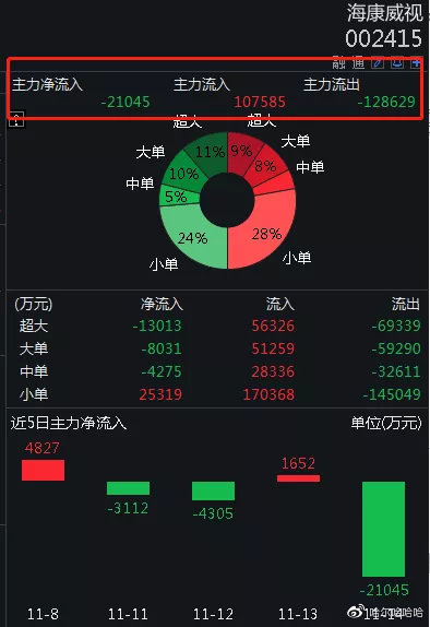 而从资金流动的情况看,当日主力流出超12亿元,这些资金也是因海康威视出现重大利空消息而借势出逃;但同时当日主力流入量也非常高,金额达到10.7亿元,累计净流出为2.1亿元。