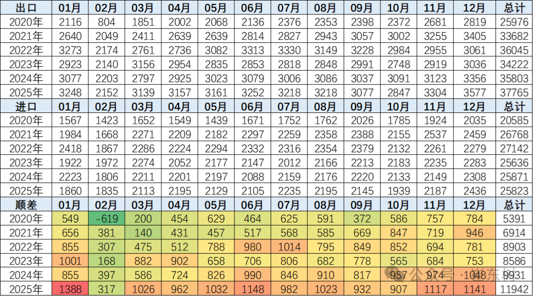 中国商品贸易出口在2025年总体表现相对平稳走强,2025年1-12月出口37765亿美元,同比增长5%。尤其在12月份,中国出口贸易增长5.5%的表现很强,12月份达到3577亿美元的今年最高水平,整体来看,中国2025年商品出口呈现平稳强势增长的良好特征。