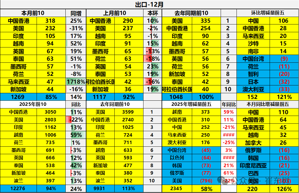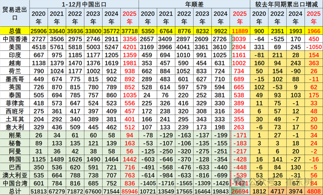 其中2025年中国对欧美国家的顺差巨大,对美国1-12月份顺差2804亿美元,对中国香港顺差3039亿美元,对印度和越南的顺差在1000亿美元左右的好水平。2025年虽然在美国干扰等各种因素影响下,导致世界各地需求不足,但中国出口总体表现依旧是极其优秀的。