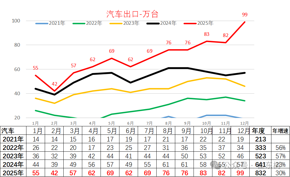 崔东树:2025年1-12月汽车出口832万台!年增30%