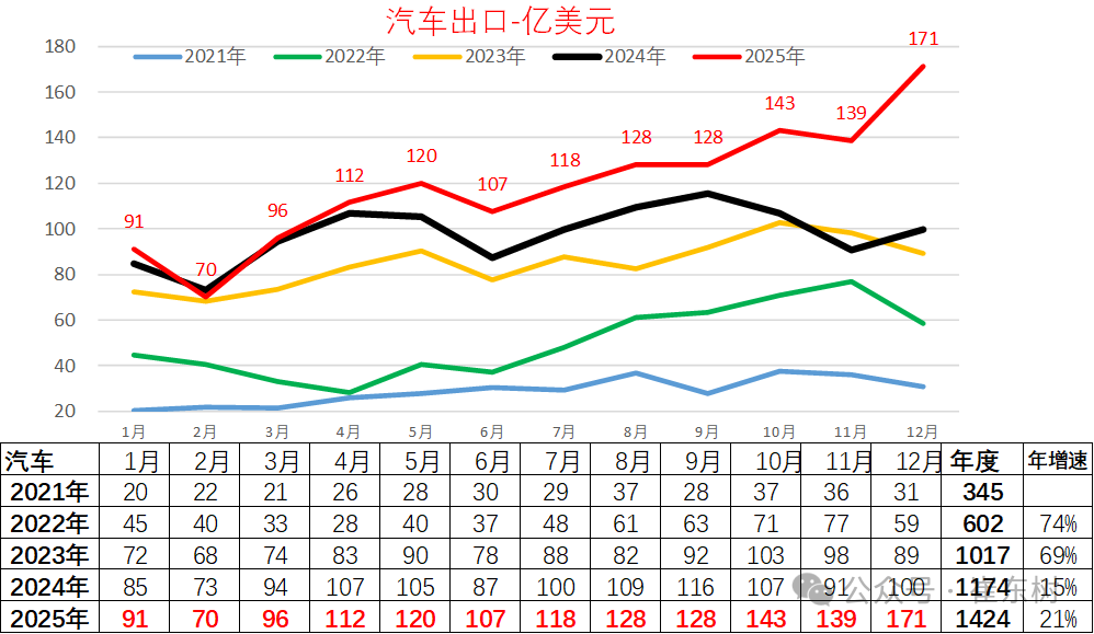 汽车出口近几年从出口方面表现极其优秀,从2021年的345亿美元上升到2024年的1174亿美元,形成了爆发增长态势,而且在2025年依旧保持月度小幅的增长特征。4季度汽车出口暴增,全年达到1424亿美元,汽车出口创汇巨大。