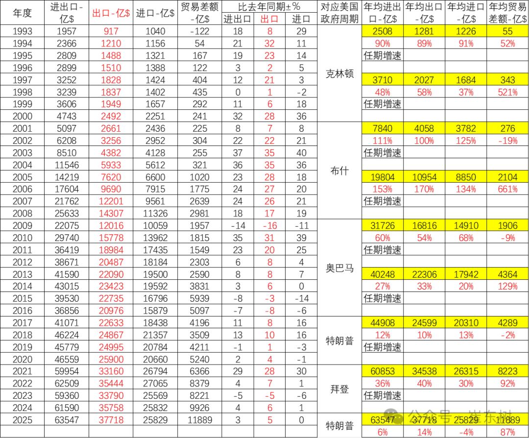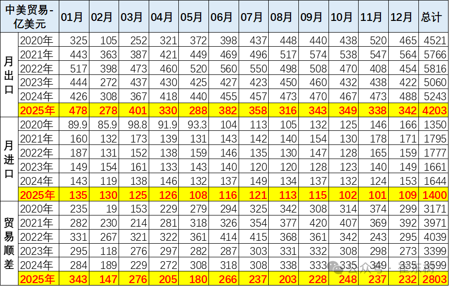 中国对美国出口在2021年拜登上台后因疫情因素形成超强增长的态势,从2020年的出口4521亿美元到2022年5816亿美元,形成较强的增长特征。2021-2025年形成了中国对美出口超强的良好增长特征。