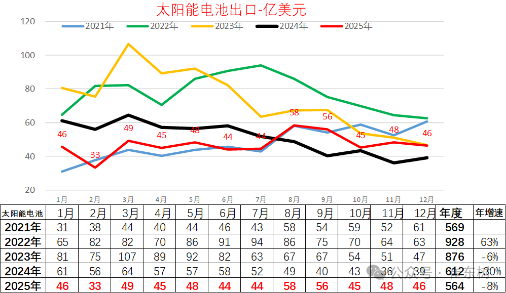 太阳能电池作为新三样的重要优势产品,出口表现波动大,近两年下滑严重,行业内卷严重。太阳能电池应该说在俄乌危机爆发的背景之下,出现了爆发式增长的态势,2020年总体走势相对平稳,而2021年太阳能电池呈现了明显的上升态势,随后2022年太阳能电池又呈现了强势爆发增长态势,达到928亿美元,但2023年随着整体能源形势的相对稳定,太阳能电池的出口回落到876亿美元。2024年下降到612亿美元,2025年4-7月保持持续剧烈下行的态势,8-9月回升,10-12月回落,处于历史次低位。