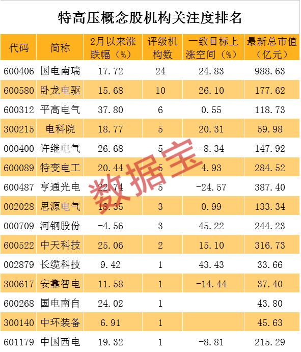 机构关注度较高的股票,或许是更加受益行业景气的龙头股。数据显示,机构关注度最高的特高压概念是国电南瑞,榜单中唯一市值达千亿级别的龙头,有24家机构评级,一致目标价26.7元,较现价有近25%上涨空间,2月份国信证券评级为增持,估值区间25-25.9元。