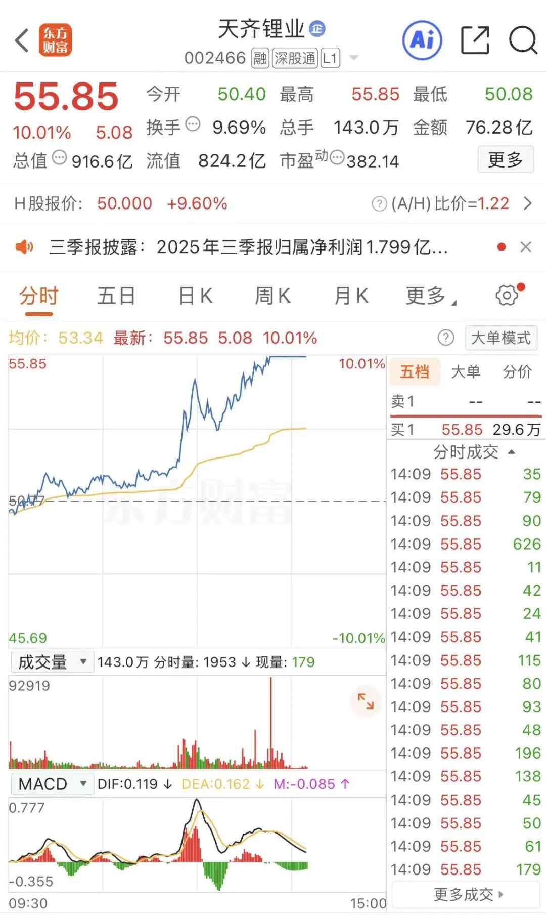 消息面上,天齐锂业于10月29日晚间发布2025年三季度报告,公司第三季度实现归母净利润9548.55万元,同比增长119.26%;归母扣非净利润6995.58万元,同比增长113.56%。前三季度,公司归母净利润约1.8亿元,同比增长103.16%。