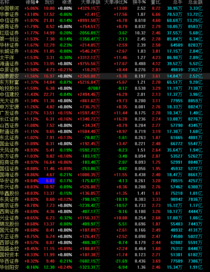 个股方面,截至10时40分,券商股除华创阳安外均全线飘红,领涨券商股为中国银河(5.06%),华泰证券(3.18%)和中信证券(1.87%)紧随其后,均为头部券商。