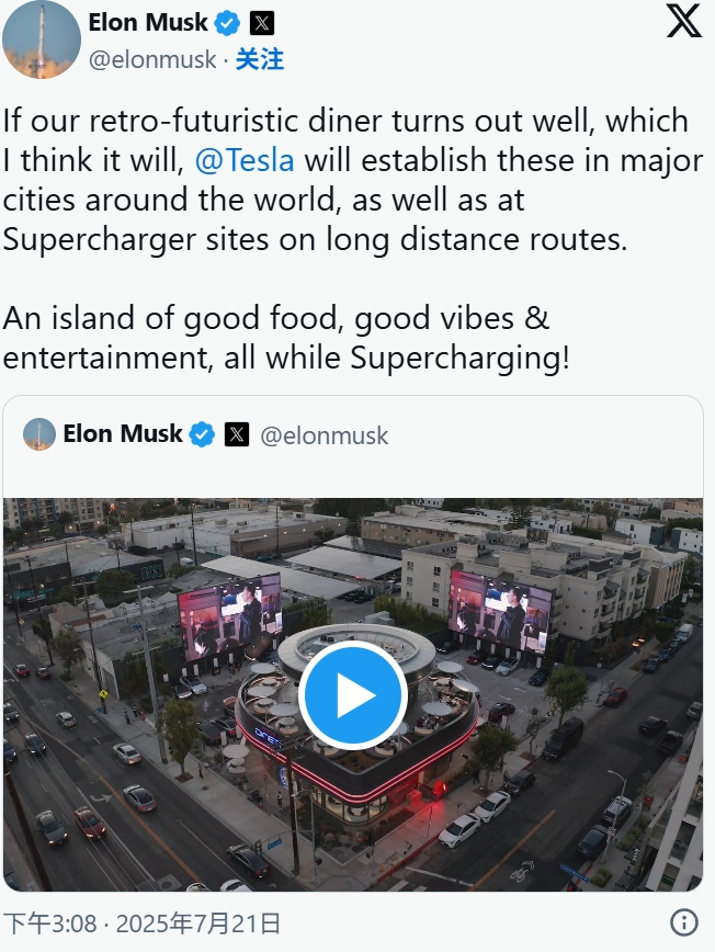 马斯克在X上写道:“如果我们的复古未来主义餐厅表现良好,我认为是会的,特斯拉将在世界各地的主要城市以及长途路线上的超级充电站建立这些餐厅。”
