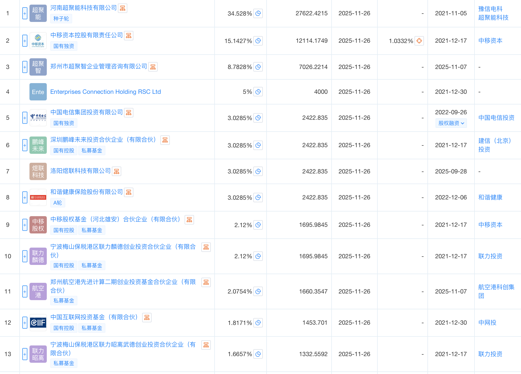 中国电信投资则加码了超聚变于2022年9月完成的融资中;此外,超聚变于2025年完成的最新一轮B轮融资中,国调基金、郑州航空港科创集团两大国有资本参股。