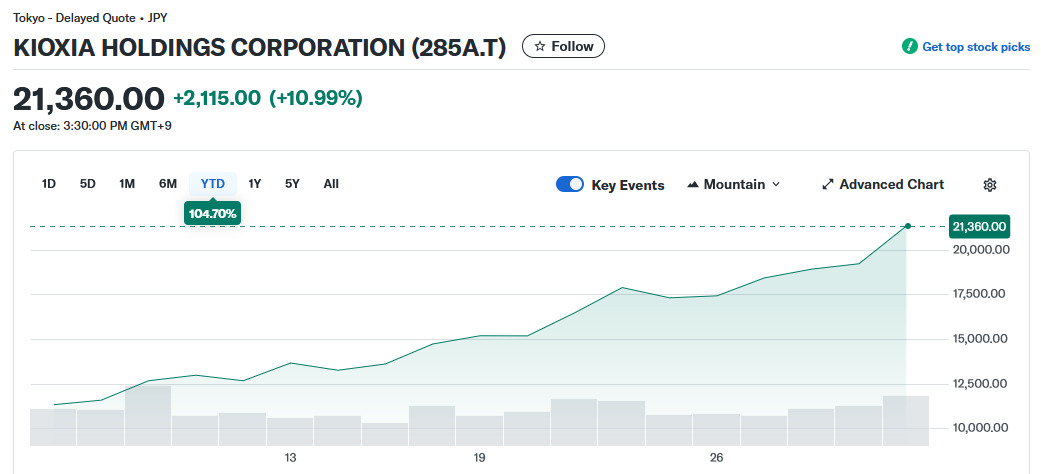 数据显示,AI对数据存储近乎“贪得无厌”的需求已推动铠侠股价今年迄今上涨约105%。这家日本NAND闪存制造商自2024年12月上市以来股价已累计暴涨近1400%,在2025年约540%的涨幅使其成为当年日本东证指数中表现最佳的股票。