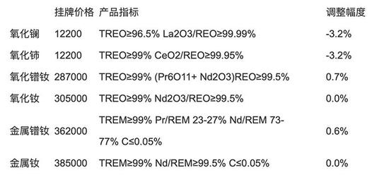 北方稀土公布的5月轻稀土挂牌价显示,氧化镧及氧化铈价格下调3.2%,而镨钕氧化物及金属价格小幅微涨。
