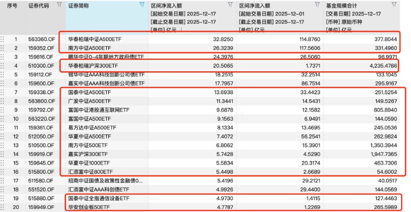 全市场A500相关ETF单日合计净流入111.6亿元,成交额第一的华泰柏瑞A500ETF获得最多资金流入,单日净流入32.83亿元,12月以来合计净流入114.88亿元,在11日规模突破300亿元基础上,继续攀高至当前的377.8亿元。