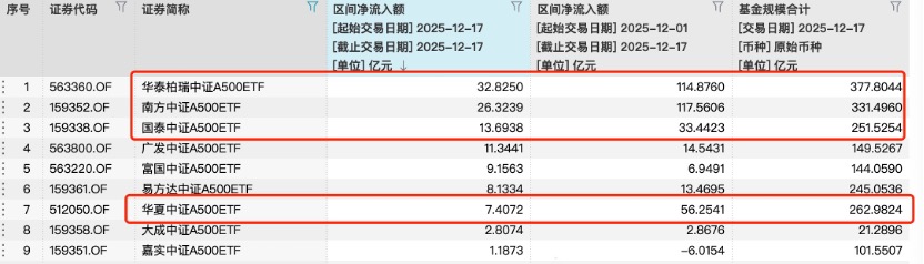 此外,国泰A500ETF、广发A500ETF均获得超10亿元的资金净流入,富国A500ETF、易方达A500ETF以及华夏A500ETF等亦有资金买入。其中,华夏A500ETF在12月净流入仅次于华泰柏瑞与南方旗下A500ETF,该基金最新规模为262.98亿元,同类排名第三。