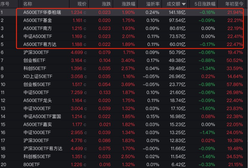 这一次大资金进击,放巨量的主角是A500ETF。截至收盘,5只A500ETF领跑市场,合计成交额合计达452.91亿元,其中,华泰柏瑞A500ETF成交额达141.18亿元,华夏A500ETF以97.54亿元次之,南方、国泰、易方达旗下A500ETF成交额紧随其后。
