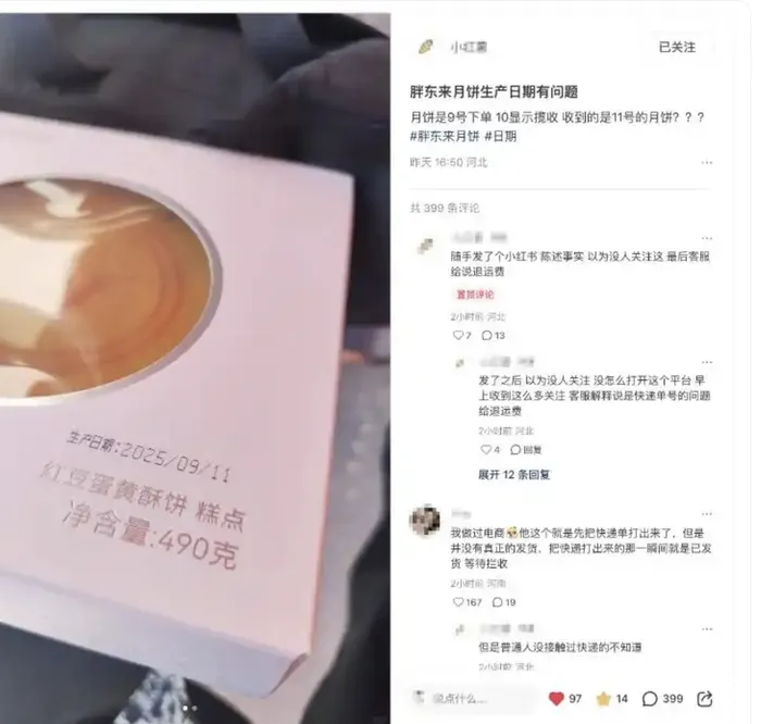 9月9日在胖东来网购红豆蛋黄酥饼,物流信息显示10日已揽收,然而收到的产品外包装显示生产日期却是“9月11日”。