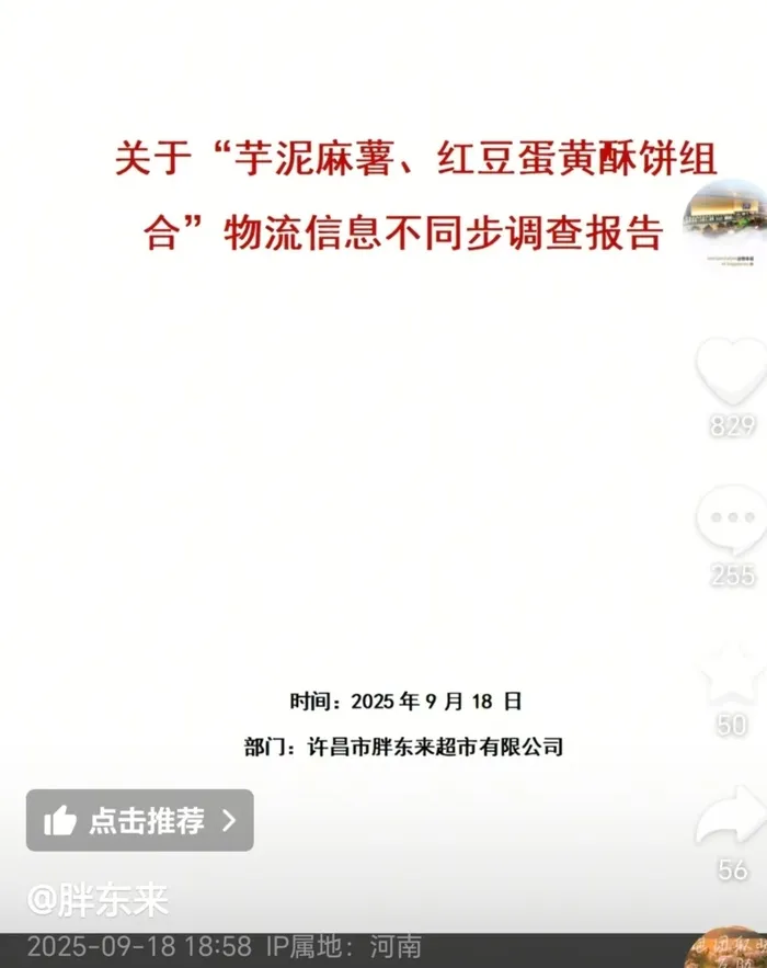 针对此事,9月18日下午,胖东来发布关于“芋泥麻薯、红豆蛋黄酥饼组合”物流信息不同步调查报告。