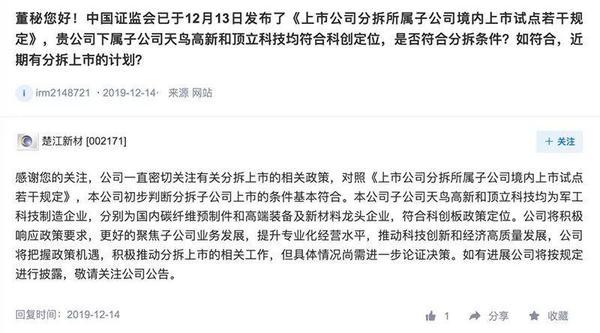 楚江新材的天鸟高新和顶立科技同样受到关注,公司则称“将把握政策机遇,积极推动分拆上市的相关工作,但具体情况尚需进一步论证决策。”