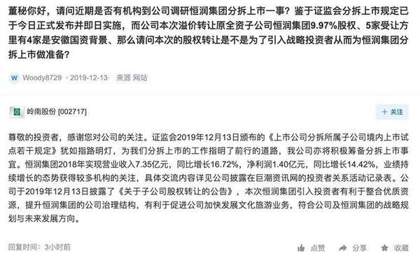 岭南股份15日晚在互动易回复投资者称,“证监会2019年12月13日颁布的《上市公司分拆所属子公司境内上市试点若干规定》犹如指路明灯,为我们分拆上市的工作指明了前行的道路,我公司亦将积极筹备分拆上市事宜。”