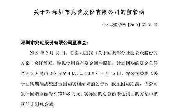 兆驰股份曾在2019年5月领到深交所下发的监管函,理由是公司回购股份实际金额未达到回购方案中披露的计划总金额。