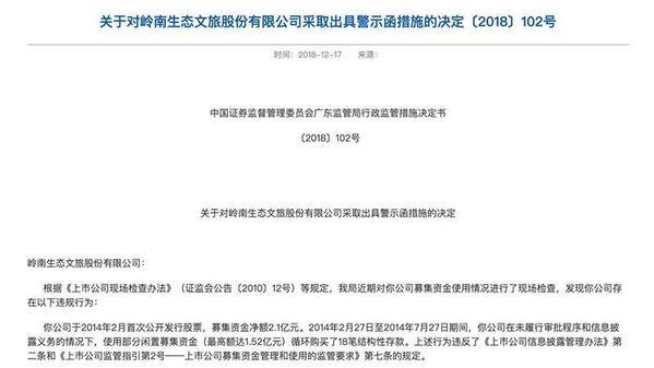 2018年,岭南股份曾因公司在为旅行审批程序和信息披露义务的情况下使用部分闲置募集资金(最高额达1.52亿元)循环购买了18笔结构性存款,而收到过中国证监会广东监管局的《行政监管措施决定书》。