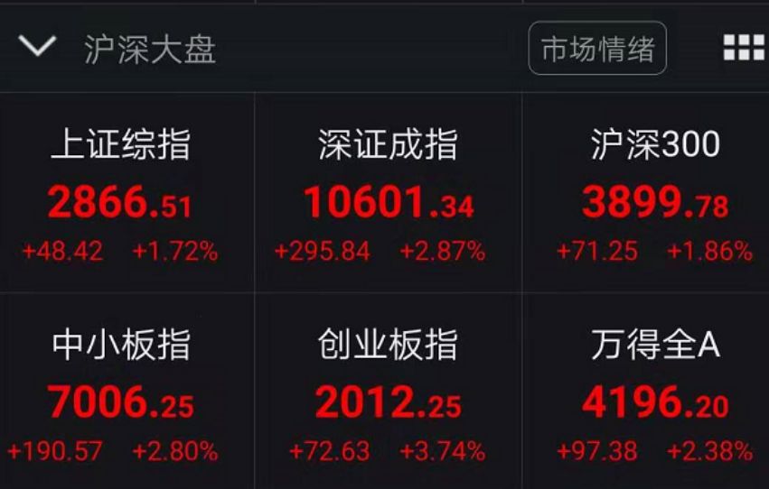 截至当日收盘,上证综指收盘报收2866.51点,涨幅1.72%;深证成指收盘报10601.34点,涨幅2.87%;创业板指数收盘报2012.25点,涨幅3.74%。
