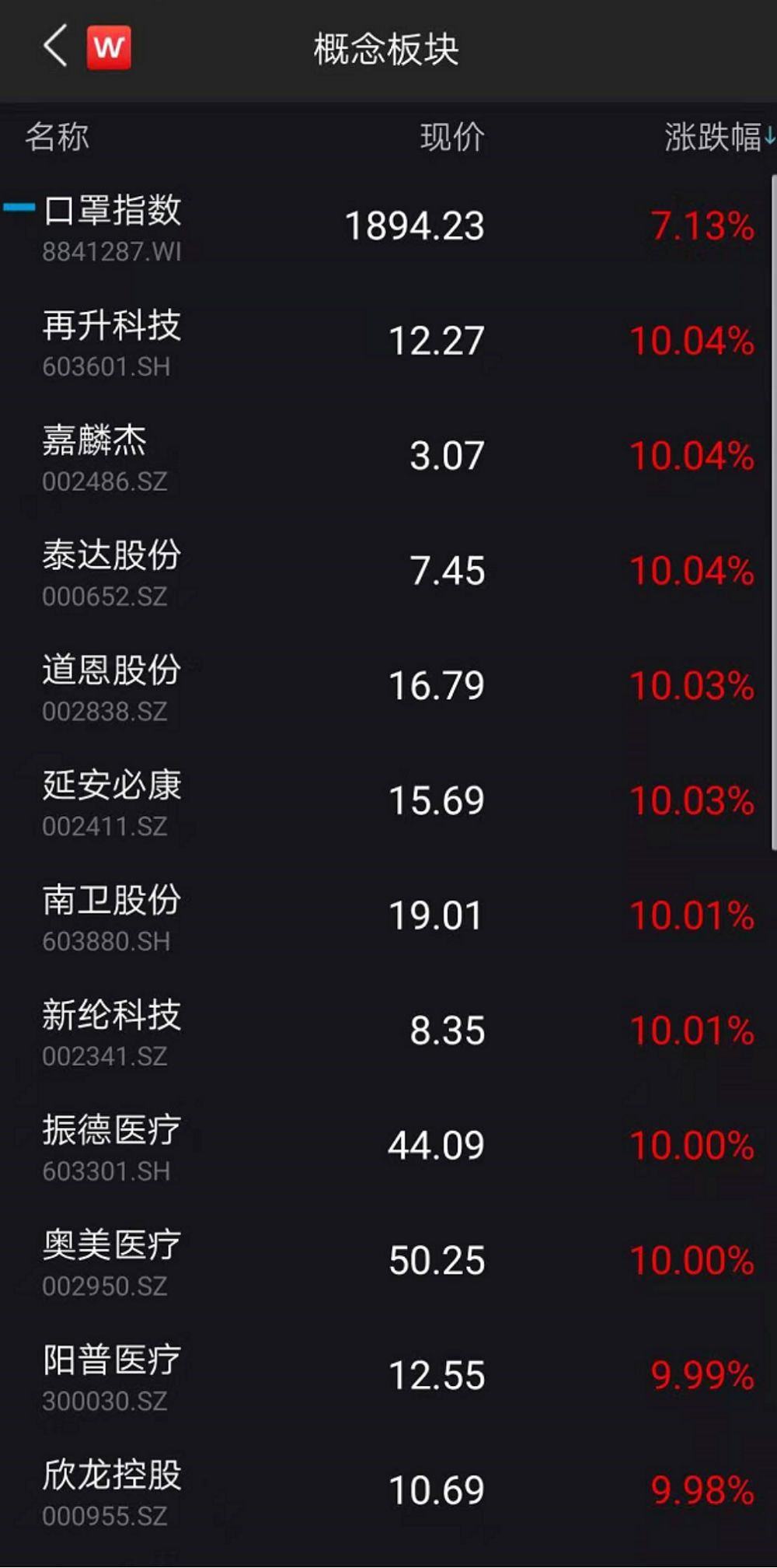 巨量成交下,市场热点板块精彩纷呈。Wind概念板块中,口罩、血液制品、在线教育、肺炎概念、移动转售、智慧医疗、云办公、网络游戏等10多个板块涨幅超过5%。