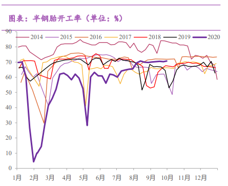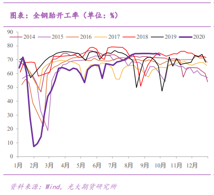 此外国内疫情的逐步稳定也带来了工地开工率的提升。根据期货日报公布的数据,截至10月20日,全钢和半钢胎开工率分别为74.69%和70.21%,分别较去年同期上涨2.74%和3.4%。