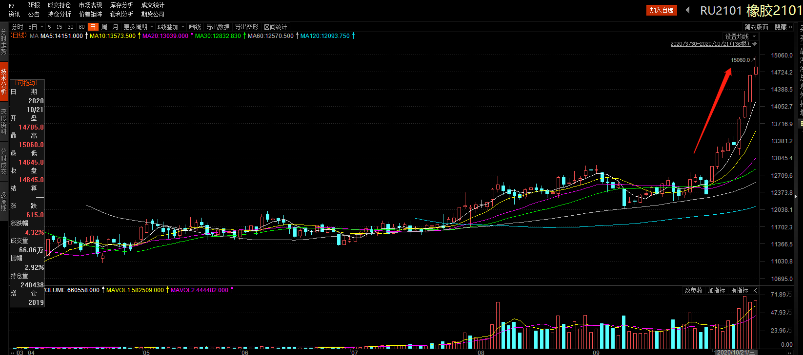 进入10月以来,橡胶价格一路高歌猛进。橡胶主力2101合约在10月12日突破13000大关,仅8天之后的10月20日就上冲至14000的高位。今日早盘已经达到了15000元/吨,刷新了近三年的新高。