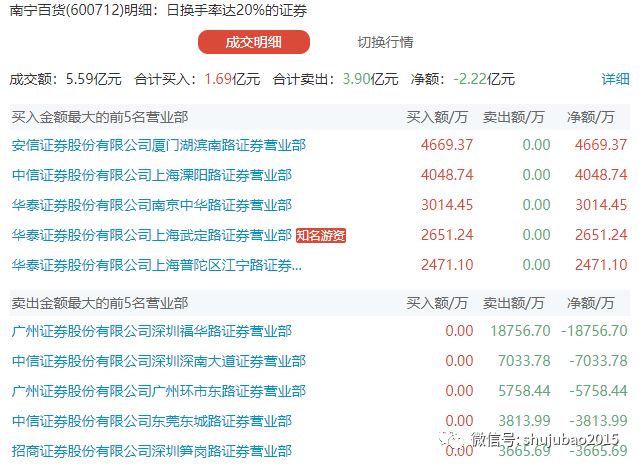 从南宁百货周五盘后龙虎榜资金数据来看,游资分歧加大,当天龙虎榜资金净卖出2.22亿元。卖出席位全部来自珠三角地区,卖出力度最大的是广州证券深圳福华路营业部,净卖出高达1.88亿元,中信证券深圳深南大道营业部、广州证券广州环市东路营业部净卖出均超过0.5亿元。买入席位中,大部分为长三角地区游资,其中知名游资中信证券上海溧阳路营业部净卖出逾0.4亿元。
