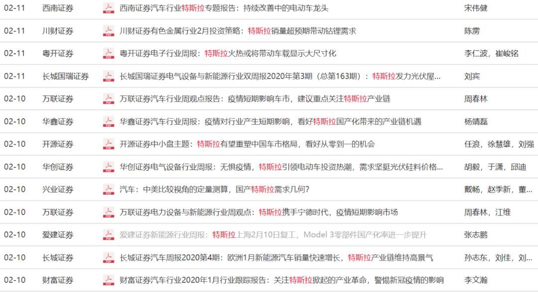 特斯拉概念股的突出表现,自然少不了卖方机构和买方机构的参与。Wind数据显示,以特斯拉作为关键词进行研报搜索,截至2月11日,今年以来的券商研报数量便达到171篇之多,相当于每个交易日便有7.4篇研报出炉。