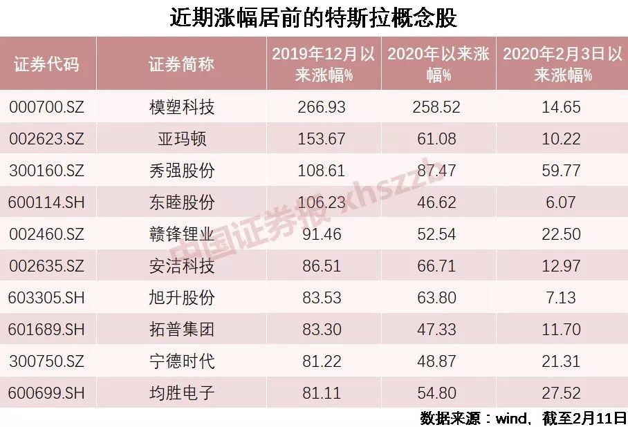 从近期表现看,特斯拉概念股十分突出。Wind数据显示,截至2020年2月11日,特斯拉板块2019年12月以来的涨幅为50.33%,位居全部概念板块涨幅第7位;2020年以来的涨幅为28.68%,位居全部概念板块涨幅第8位;2月3日以来的涨幅也达到了8.35%。