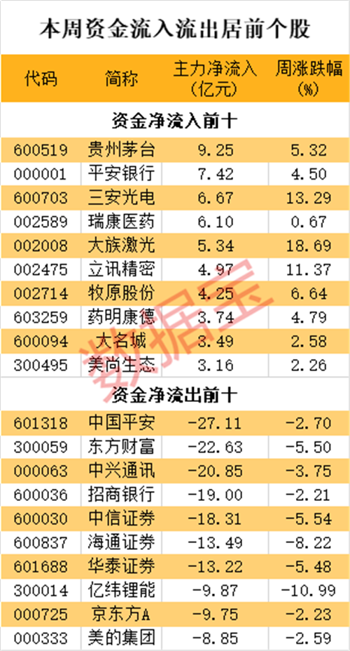从市场资金流向来看,本周仅600余股资金净流入,资金净流出个股超3000只。贵州茅台本周资金流入量居首位,达到9.25亿元,本周成交金额212.4亿元,主力资金净流入率4.35%。华泰证券指出,茅台酒价格持续高位运行,印证了市场需求的强劲。公司坚定执行控价稳市政策,对重点市场进行精准投放。增加旺季产品供给量,公司或将提前执行4季度计划量。端强劲的需求为公司全年业绩保驾护航,公司业绩或将持续提升。