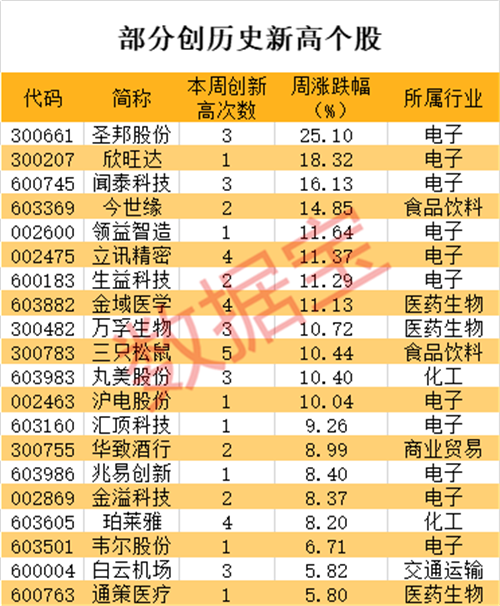 从创新高次数来看,本周仅三只松鼠连续5天都创新高,不过,该股周五创出新高后,股价掉头向下,午盘封死跌停。立讯精密、珀莱雅、金域医学三只个股本周有4天股价创历史新高。另外,还有包括万孚生物、圣邦股份、白云机场等6只个股本周有三天创出新高。