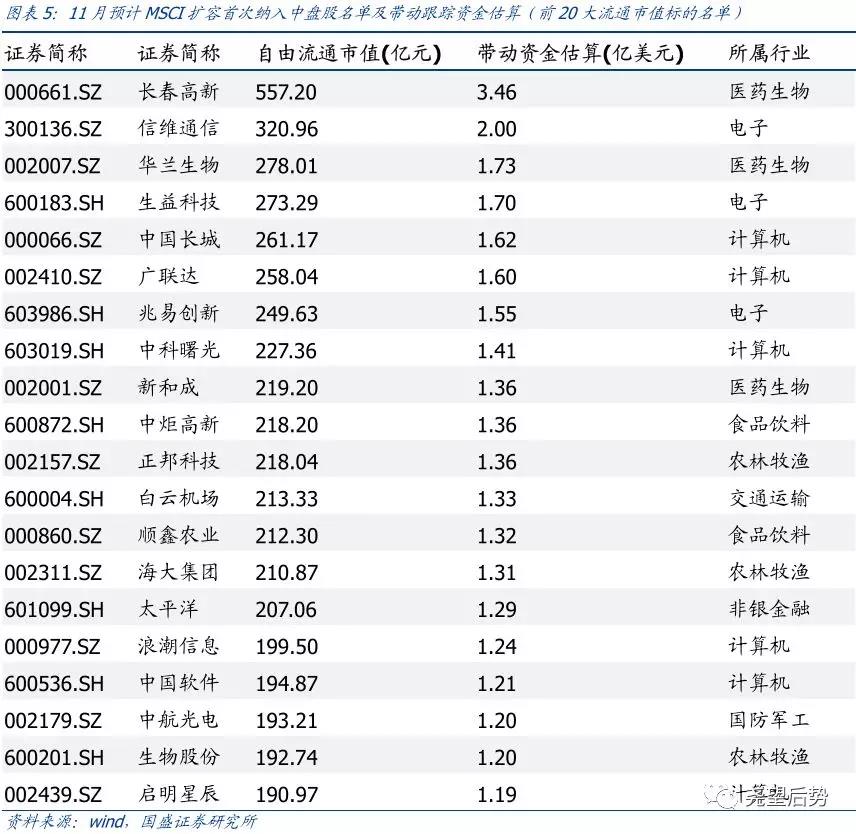 国盛证券建议关注,MSCI纳入创业板标的名单,以及根据此前披露名单对于MSCI中盘股带动增量资金可能较多的个股。