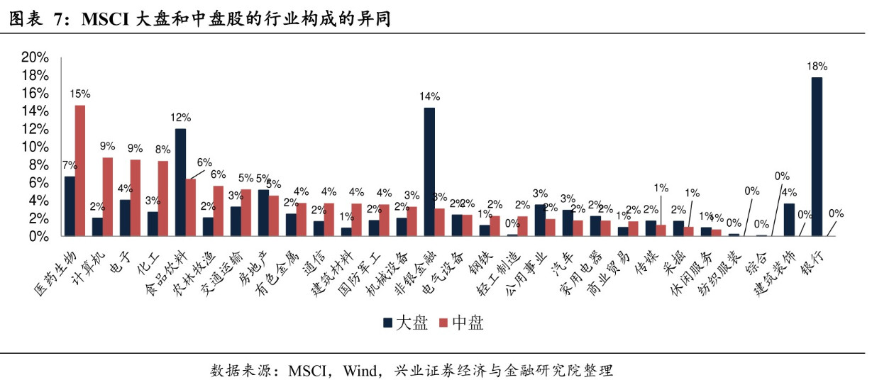 不同于此前的两次扩容,11月底MSCI在提升大盘A股因子的同时,还将首次纳入175只中盘股,并将其纳入因子一次性提升至20%。根据目前披露的MSCI纳入A股中盘股及大盘股名单统计,中盘股自由流通市值合计约为大盘股自由流通市值的17%。