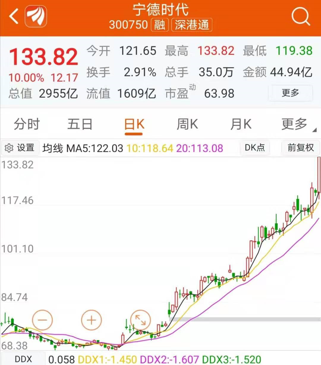 特斯拉在1月22日凌晨的表现,极大的鼓励了A股散户和机构投资者的做多兴趣——继续推高A股上市公司宁德时代的股价,因后者是全球最大的汽车动力电池供应商。1月22日,宁德时代在拉上涨停板后收于每股133.82元,市值达到2955亿,距3000亿市值关口已近在咫尺。