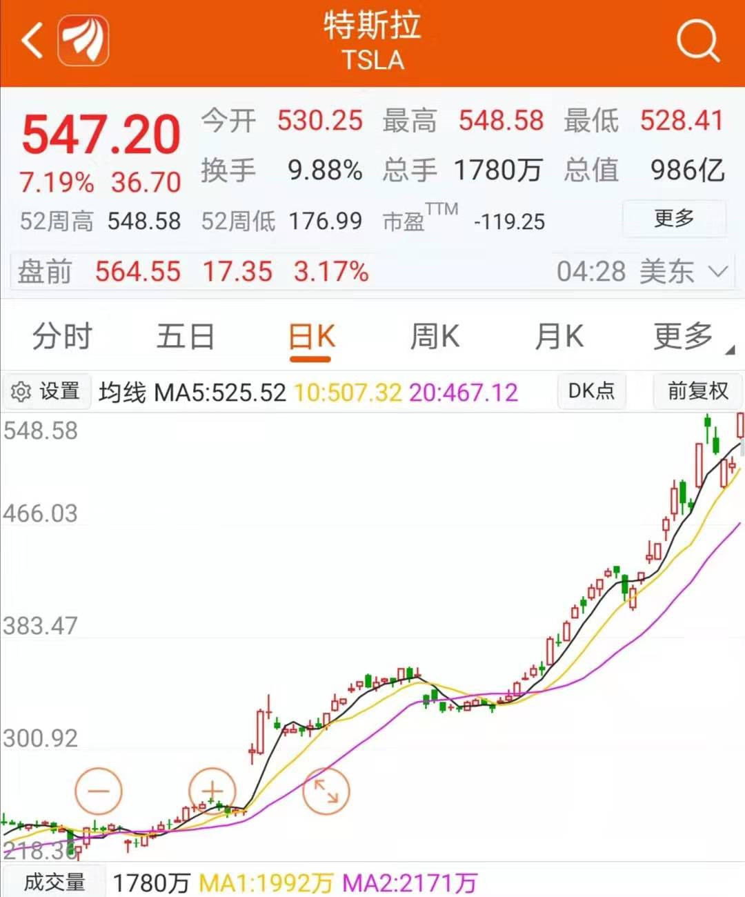 其中,基金重仓股宁德时代在当前A股市场的表现,最令人瞩目,该股今日被资金强拉涨停。市场分析人士认为,这与隔夜美股特斯拉股价表现相关,截止北京时间1月22日凌晨五点,特斯拉公司的股价盘中大涨7.19%,每股股价达到547.20美元,也就是说,开年不到一个月,特斯拉股票又上涨了30%,特斯拉也因此成为首家市值超1000亿美元的汽车公司。