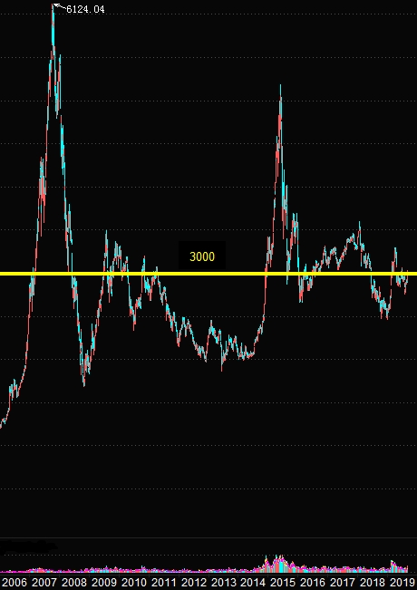 如果算上冲击3000点成功的次数(开盘价低于3000点,收盘价高于3000点的情形),自从2007年2月16日首次上破3000点之后,近10多年间,沪指已向3000点发起了63次(成功35次)冲击,由此可见3000点一线的重要性。事实上,按照沪指最高点6124.04点和股市成立初期的95.79点计算,3000点位置基本就是50%位置。