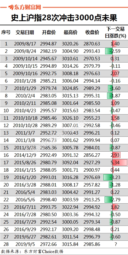 算上这一次,对于沪指来说,是2007年2月16日首次突破3000点后第28次冲击3000点未果(当日开盘价低于3000,最高价高于3000,收盘价低于3000的情形)。