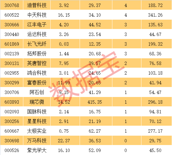 数据宝统计显示,属于计算机、电子、通信、传媒四大行业的股票中,有40多只个股最新价仍在20日均线上方且年内股价涨幅超过10%。万马科技20日线乖离率最高,达到22.37%。该股身兼5G概念、数据中心概念等多重热门科技题材于一身,股价已经连续八连阳,期间有3个涨停板。另外,福日电子、盛洋科技、中天科技等个股乖离率均超过10%。