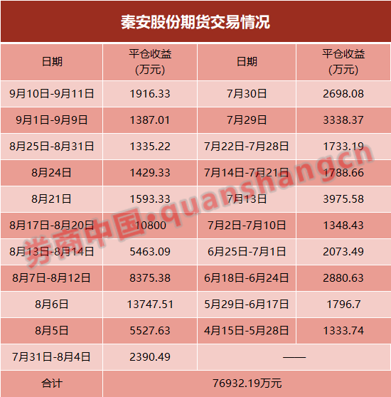 而从实际情况看,秦安股份近期确实已在转出期货收益。9月10日-9月11日在取得最新一批期货平仓盈利后,该公司转出了4000万元。8月20日前后更是曾一次性净转出1.2亿元期货收益。
