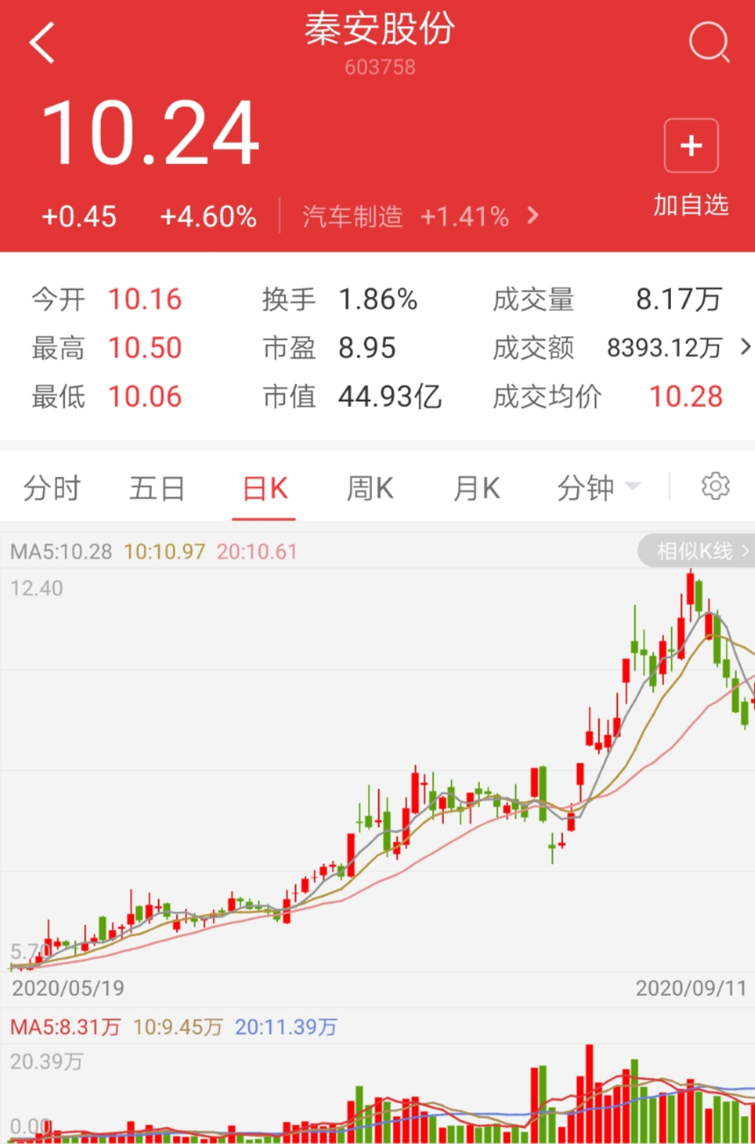 由于此前股价涨速过快,该公司的股份回购实施进度受到不小影响。9月以来,秦安股份股价连续调整,最新报价为10.24元/股,自高点回落超过20%。在上调回购价上限后,回购计划重回可操作区间。