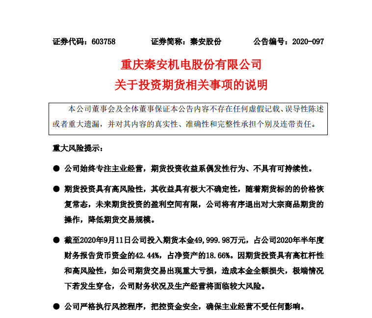 秦安股份14日晚发布最新公告,对投资期货相关事项进行了说明,承诺将有序退出。