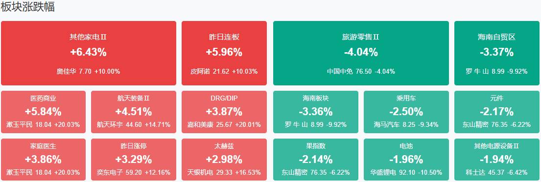 板块方面,医药商业、银行、零售等板块涨幅居前,电池、电网设备等板块跌幅居前。截至收盘,沪指涨0.16%,深成指跌1.29%,创业板指跌2.17%。