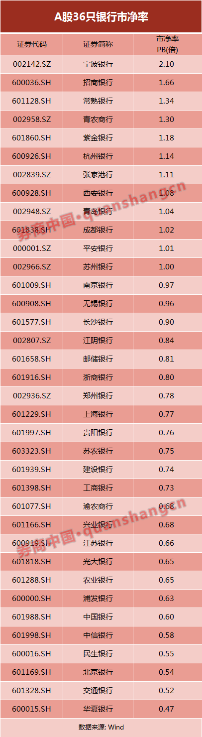 即便经历一轮普涨之后,A股36只银行股仍有24只“破净”。据Wind数据,截至8月14日,仅有宁波银行、招商银行、常熟银行、青农商行、紫金银行、杭州银行、张家港行、西安银行、青岛银行、成都银行、苏州银行、平安银行12股市净率超过1倍。
