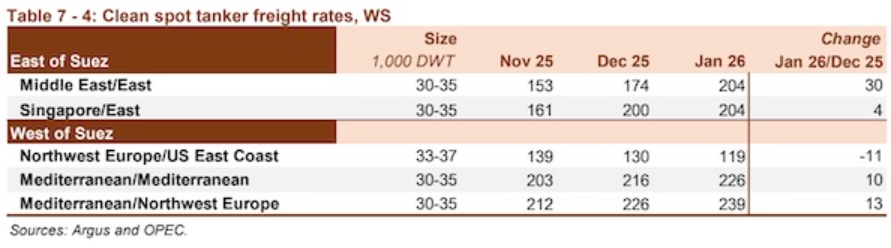 清洁即期运费表现强劲,以中东地区的出口为主导。苏伊士以东地区的运费平均环比上涨9%,而苏伊士以西地区的运费环比上涨2%。与前一年相比,苏伊士以东地区运费上涨40%,而苏伊士以西地区运费上涨18%。中东至东行航线的运费上涨17%,平均为WS204。与2025年1月相比,运费高出40%。