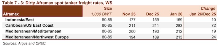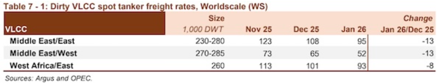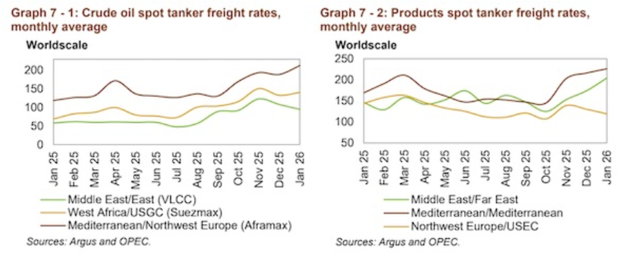 欧佩克在最新月度报告中表示,油轮市场在2026年开局表现积极。在地缘政治不确定性、天气干扰、计划外停产以及稳定的装货活动的支撑下,黑油轮即期运费在1月份迎来强劲开局。VLCC即期运费在2026年初表现异常强劲,这一势头也蔓延至较小船型。中东至东行航线的即期运费达到了至少十年来的1月最高水平,同比上涨64%。