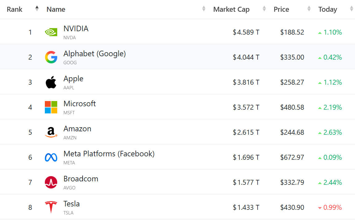 大型科技股多数收涨,(按市值排列)英伟达涨1.1%,谷歌C涨0.42%,苹果涨1.12%,微软涨2.19%,亚马逊涨2.63%,Meta涨0.09%,博通涨2.44%,特斯拉跌0.99%。